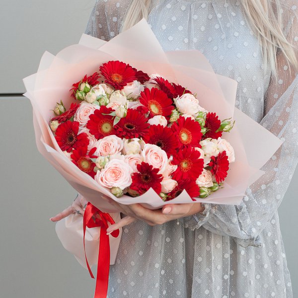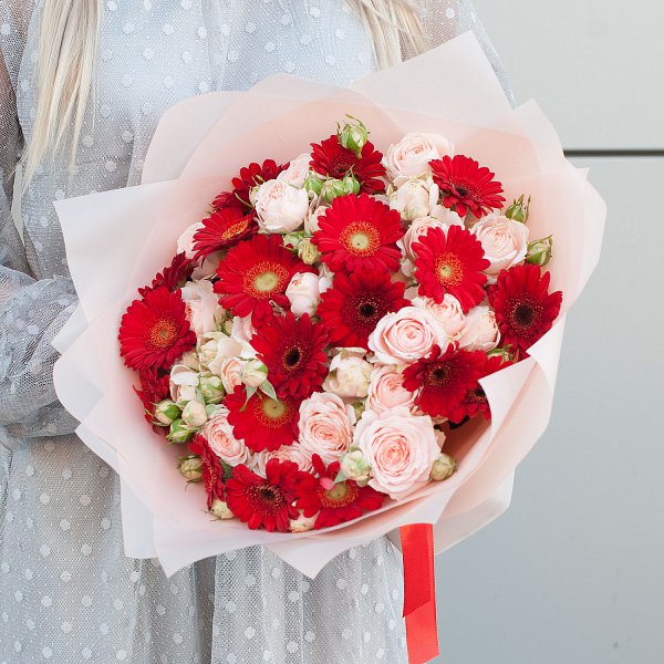 Букет из красных минигербер и пионовидных кустовых роз "Жажда цвета" - это стильный и яркий подарок, который подойдет для любого повода.