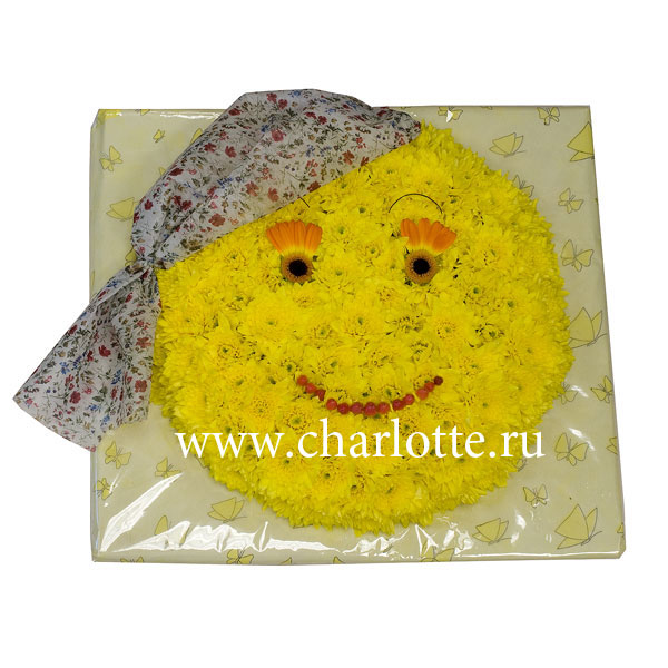 Смайлик в бондане из хризантем, гербер, гиперикума - такой необычный подарок поднимет настроение в любой самый пасмурный день.