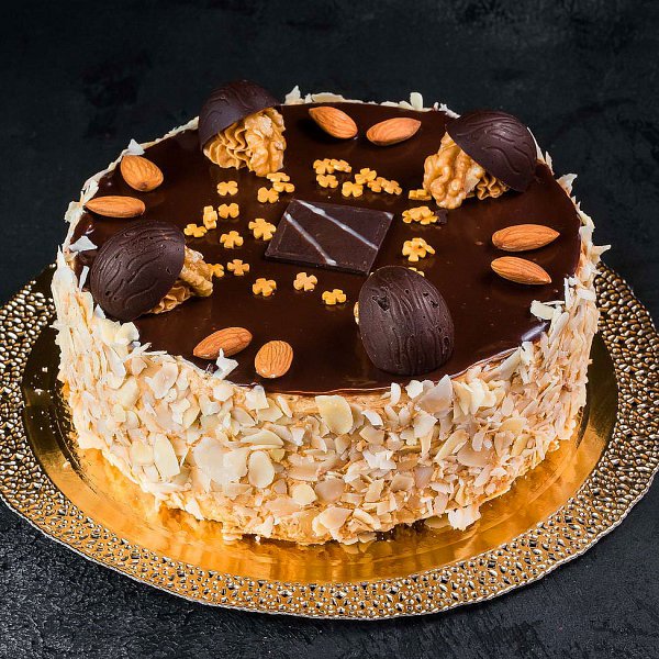 крем на растительных маслах «Сгущенка вареная» (сахар, сухое обезжиренное молоко, заменитель молочного жира, эмульгатор, антиокислитель, стабилизатор, консервант), спред растительно-сливочный, орех кешью, сахар, белок яичный, начинка ганаш черный шоколад, масло сливочное, мука рисовая, глазурь кондитерская темная (сахар, заменитель масла какао, какао-порошок, соль, ароматизатор, эмульгаторы), лепестки миндаля, ядро грецкого ореха, ядро миндального ореха, крахмал картофельный, посыпки кондитерские декоративные (сахар, мука рисовая, масло пальмовое, носитель, декстроза, эмульгатор лецитины, глазирователь, красители, ароматизатор ванилин), глазурь кондитерская белая (сахар, заменитель масла какао, эмульгаторы, сыворотка молочная сухая, ароматизаторы, эмульгаторы)