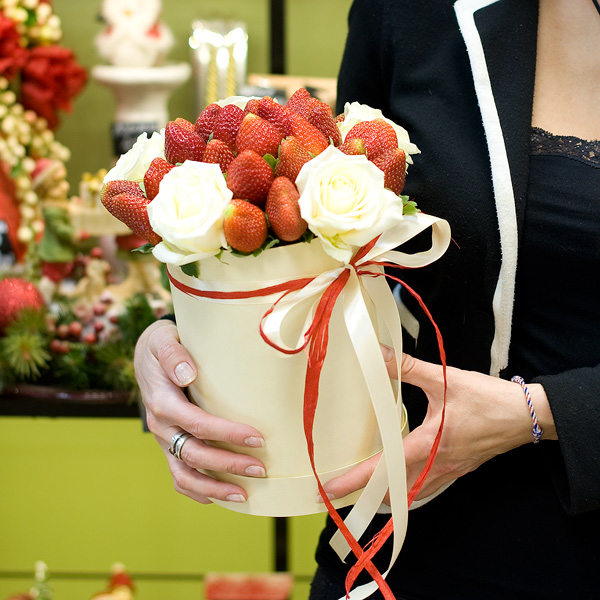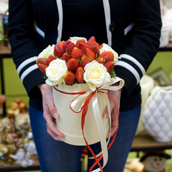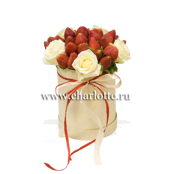 Шляпная коробка в красно-белых тонах со свежей клубникой и белыми розами. По Вашему желанию цветовую гамму композиции можно изменить, для этого звоните в наши салоны цветов или указывайте в разделе "комментарии для флориста" при заказе через интернет.