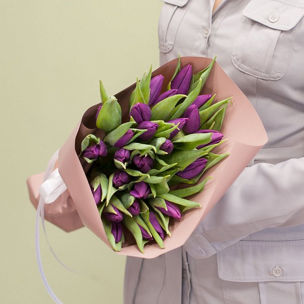 Букет из 25-ти фиолетовых тюльпанов в дизайнерской упаковке.
