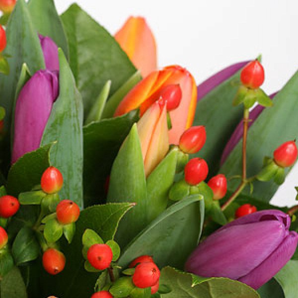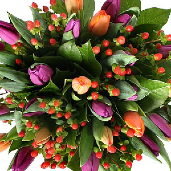Букет из сиреневых и оранжевых тюльпанов с гиперикумом с декоративной зеленью. Цветы оформляются на усмотрение нашего флориста. По Вашему желанию цветовую гамму букета можно изменить, для этого звоните в наши салоны цветов или указывайте в разделе "комментарии для флориста" при заказе через интернет.