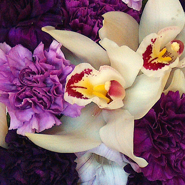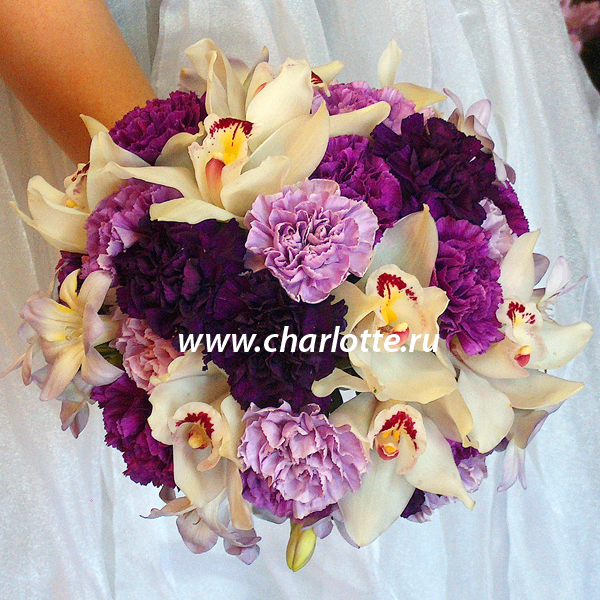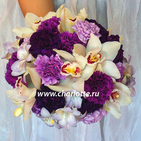 Букет невесты в бело-сиреневых тонах из экзотических гвоздик (3-х оттенков), орхидей, фрезий. Букет собран на портбукетнице.