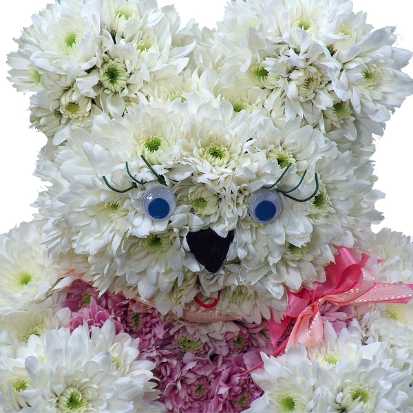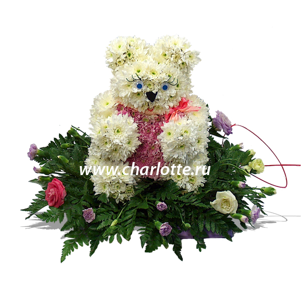 Фигурка Мишка из хризантем. По Вашему желанию можно изменить цветовую гамму, для этого звоните в наш салоны цветов или указывайте в разделе "комментарии для флориста" при заказе через интернет.