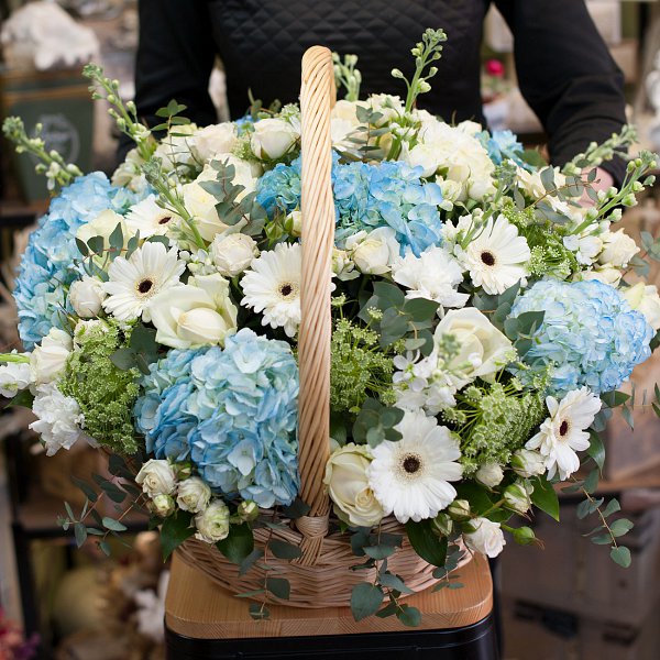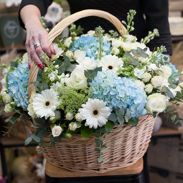 Корзина цветов в бело-голубых тонах из голубой гортензии, белых гвоздик, белой минигерберы, белой матиоллы, белой кустовой розы, а так же амми, эвкалипта и зелени.