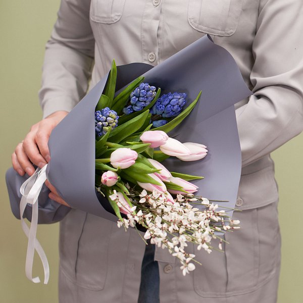 Букет из розовых тюльпанов , синих гиацинтов, белой генисты в подарочной упаковке.
