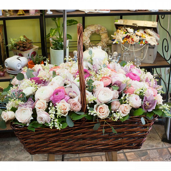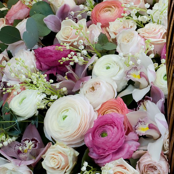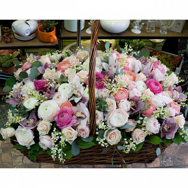 Корзина из понастоящему изысканных цветов: ландышей, ранункулусов, орхидей, пионовидной розы сорта "Девид Остин" и других цветов. По Вашему желанию цветовую гамму композиции можно изменить, для этого звоните в наши салоны цветов или указывайте в разделе "комментарии для флориста" при заказе через интернет.