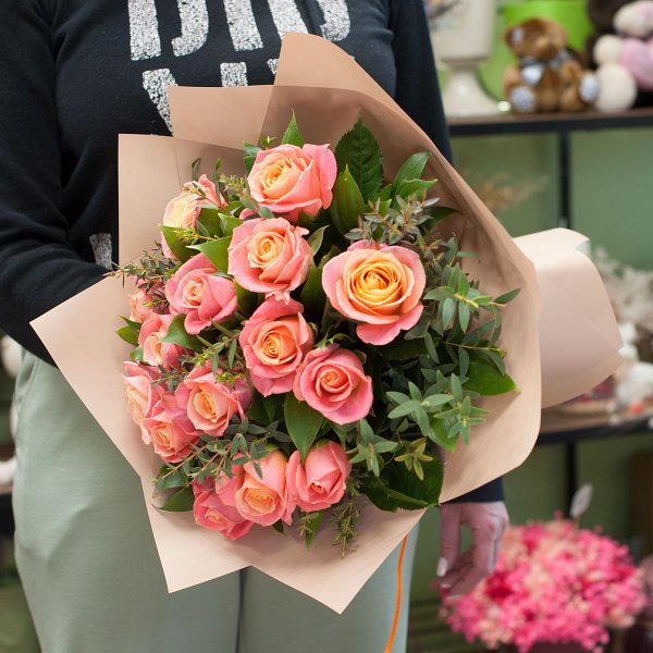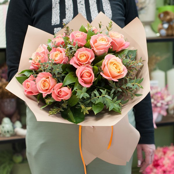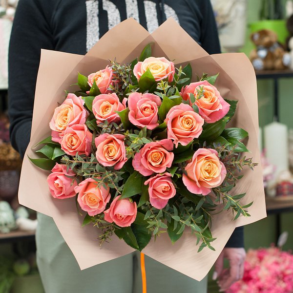 Букет из персиковых роз с декоративной зеленью в дизайнерской упаковке.