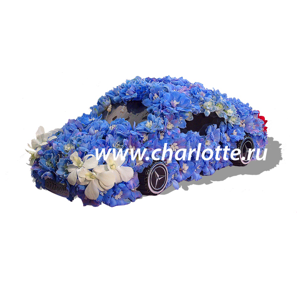 Фигура машины марки "Мерседес" из голубого дельфиниума.