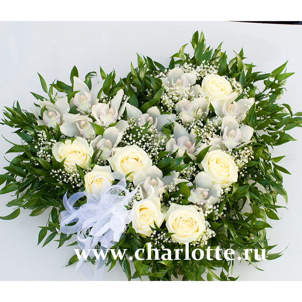 Украшение на авто из орхидей, роз, декоративной зелени в виде сердца.