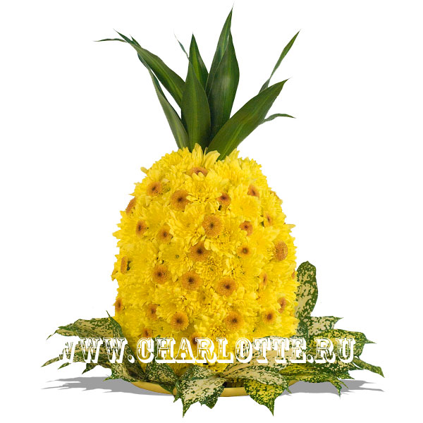 Фигура ананаса из желтой хризантемы с декоративной зеленью.