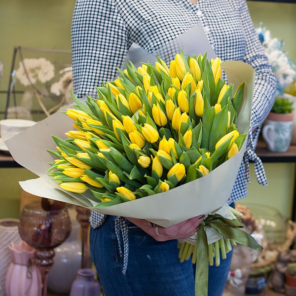 Букет состоит из 101 желтого тюльпана, что делает его ярким и запоминающимся. Тюльпаны - символ весны и радости, они добавят в ваш подарок тепло и нежность.