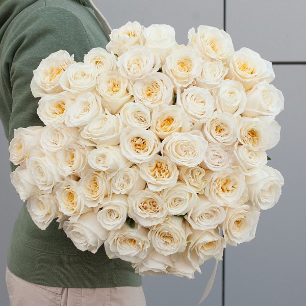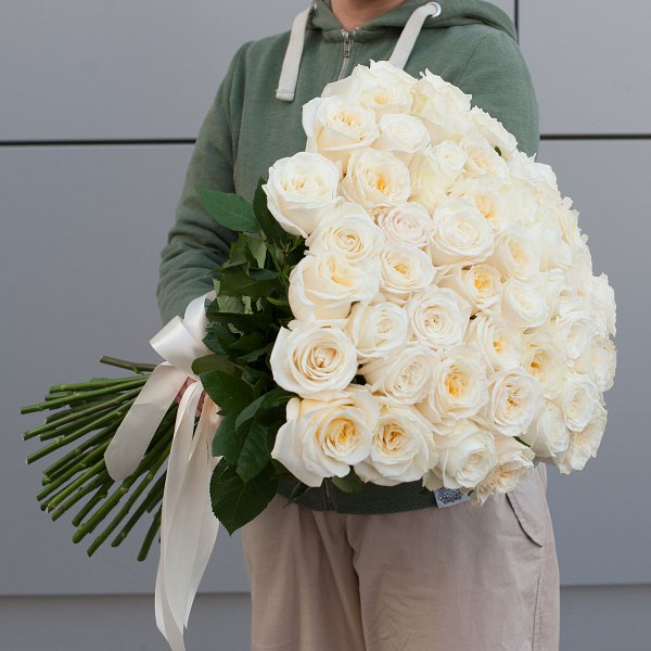Букет состоит из 51 розы белого цвета, что делает его особенно нежным и элегантным.