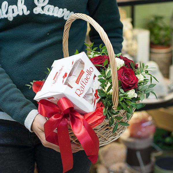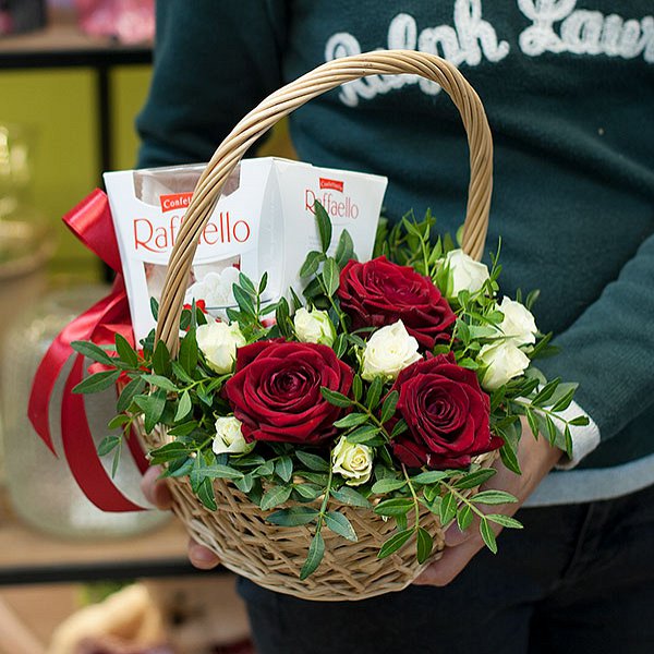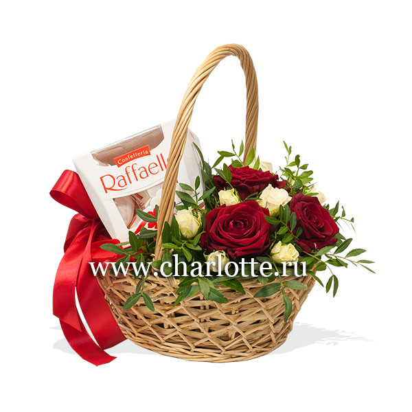 Корзина в красно-белых тонах из красных роз, белых кустовых роз с декоративной зеленью и коробкой рафаэлло 150 гр. По Вашему желанию цветовую гамму композиции можно изменить, для этого связывайтесь с нашими операторами по телефону или указывайте в разделе "комментарии для флориста" при заказе через интернет.