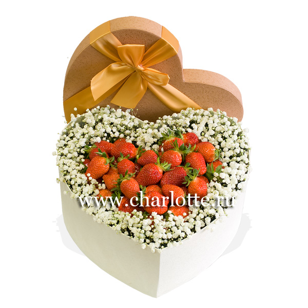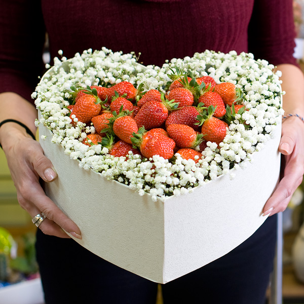 Коробка в виде сердца из клубники (700 гр.) в ореоле из гипсофилы. По Вашему желанию состав корзинки можно изменить, для этого звоните нашим операторам по телефону.