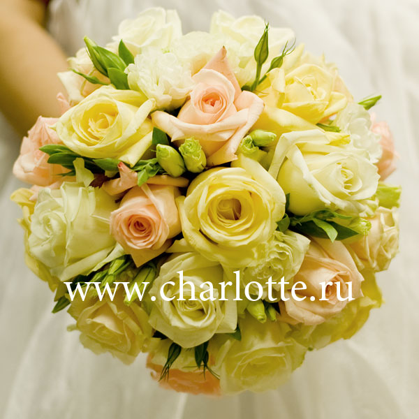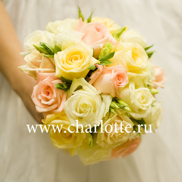 Букет невесты из роз нежно-розового, белого и кремового цветов с лизиантусом, зеленью на портбукетнице.
