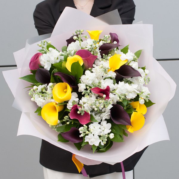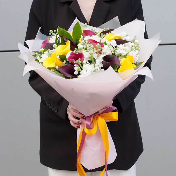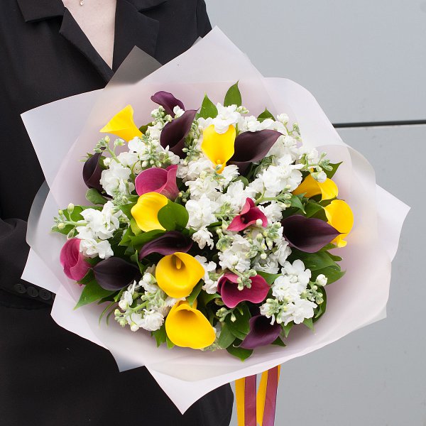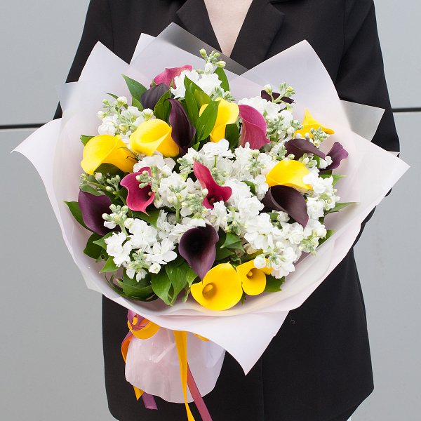 Букет "Калейдоскоп красок" - это сборный букет, состоящий из разноцветных калл и белой маттиолы. Этот букет станет отличным подарком для любого повода, будь то День семьи, день свадьбы, день рождения, юбилей или просто знак внимания.