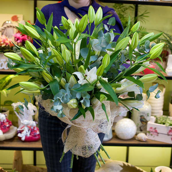 Букет из белых восточных лилий (с запахом) с декоративной зеленью в сезале. По Вашему желанию цветовую гамму букета можно изменить, для этого звоните в наши салоны цветов или указывайте в разделе "комментарии для флориста" при заказе через интернет.