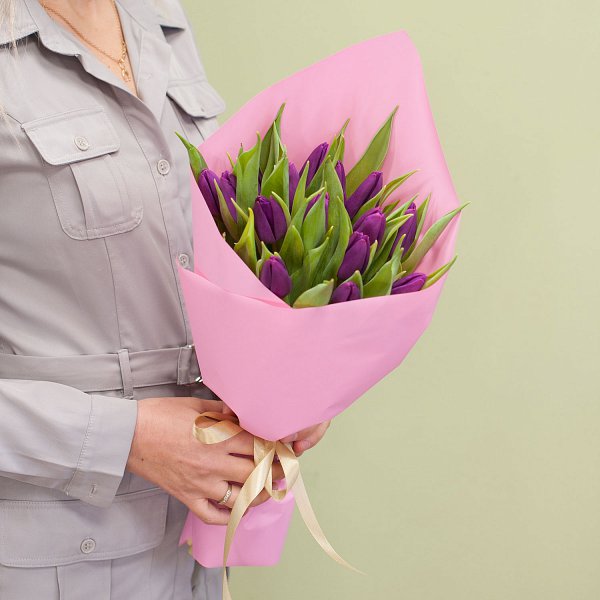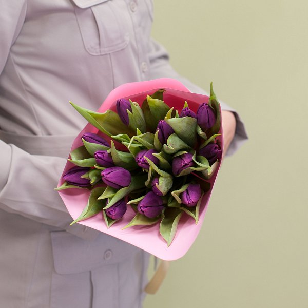 Букет из фиолетовых тюльпанов в дизайнерской упаковке.