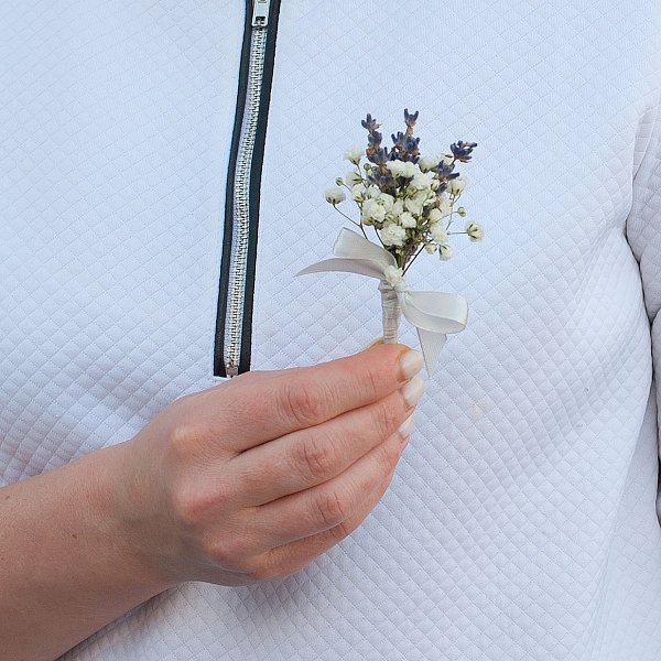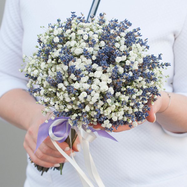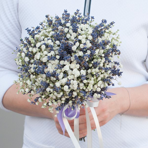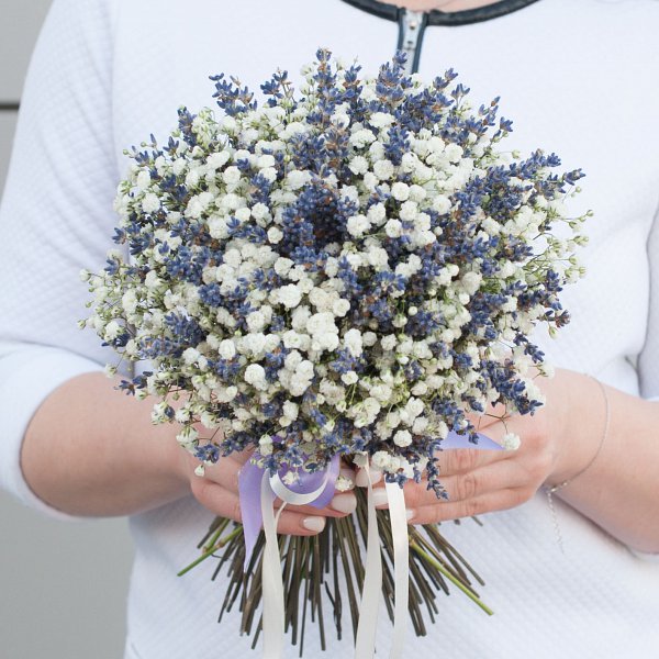 Букет состоит из двух видов цветов: лаванды и гипсофилы. Лаванда придает букету глубину и насыщенность, а гипсофила добавляет воздушности и легкости.