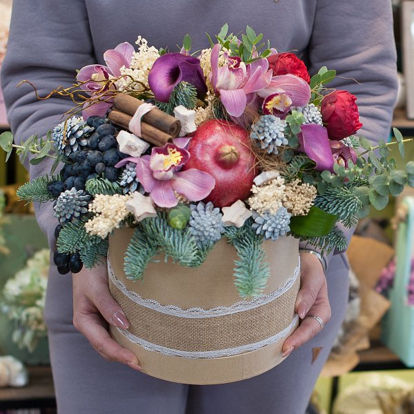 Цветочная композиция в шляпной крафтовой коробке с гранатом, черным виноградом, красными яблоками, а так же каллами, розовыми орхидеями, красными пионовидными розами с корицей, шишками, еловым лапником и эллементами новогоднего декора.