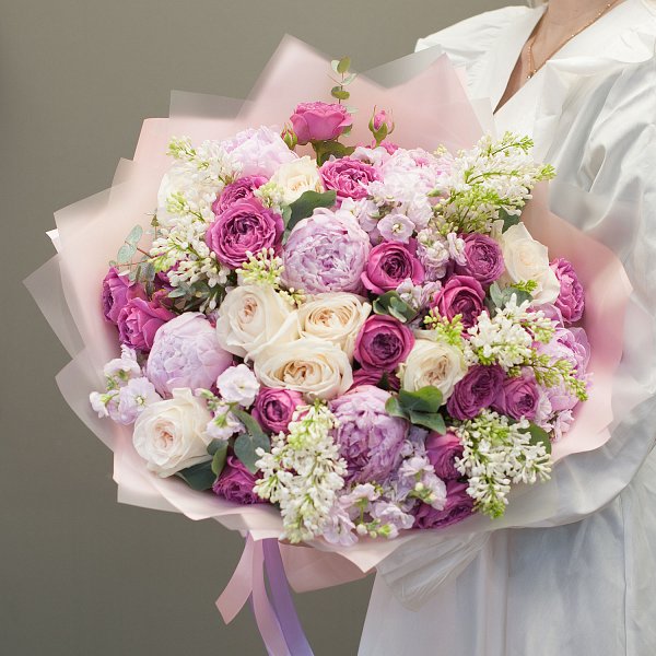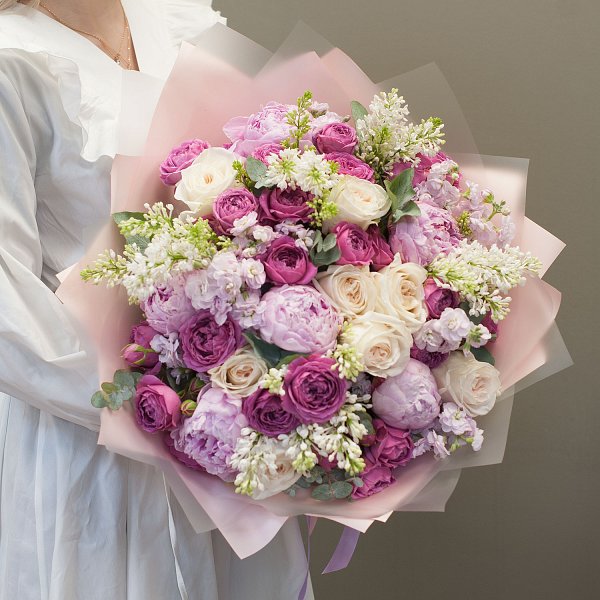 Букет цветов "Королевская аранжерея" - это уникальное сочетание пионовидных роз, пионов, сирени и других цветов и зелени. Этот сборный букет станет отличным подарком для любого случая, будь то деловая встреча, романтическое свидание или просто знак внимания для близкого человека.