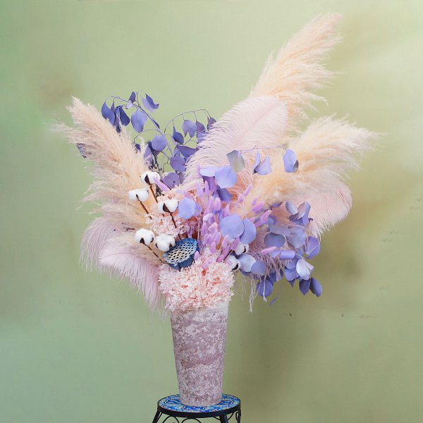 Букет "Королевская аранжерея" выполнен в розовом цвете, что делает его ярким и запоминающимся. В составе букета вы найдете гортензии, хлопок, пампас и перья, что придает ему особую изысканность и неповторимость.