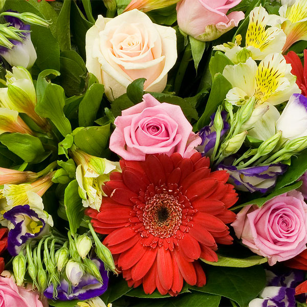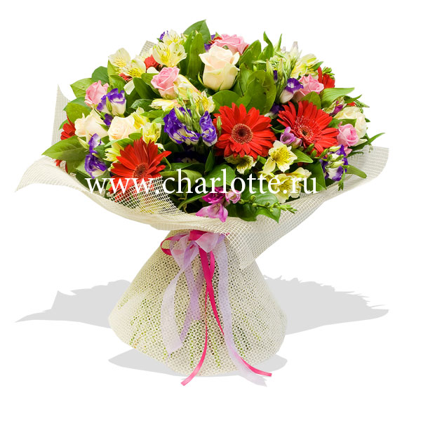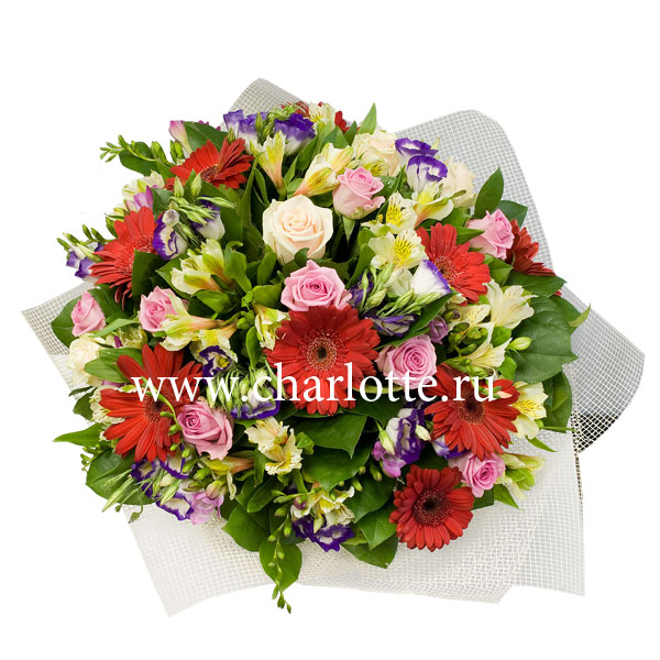 Букет из нежных роз, красных гербер, альстромерий, лизиантусов с декоративной зеленью в подарочной упаковке. Если Вы хотите изменить тона букета, звоните в наши салоны цветов или указывайте в разделе "комментарии для флориста" при заказе через интернет.