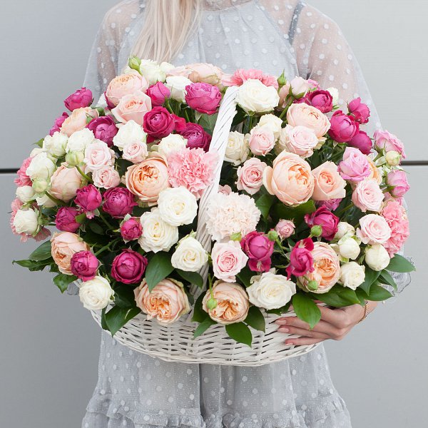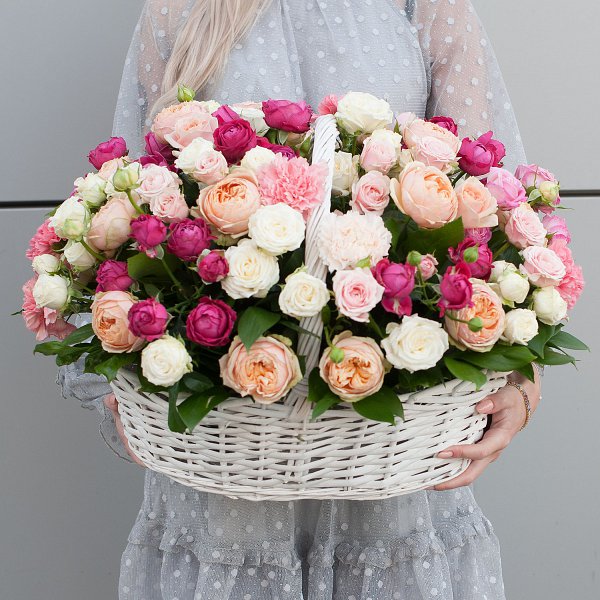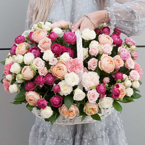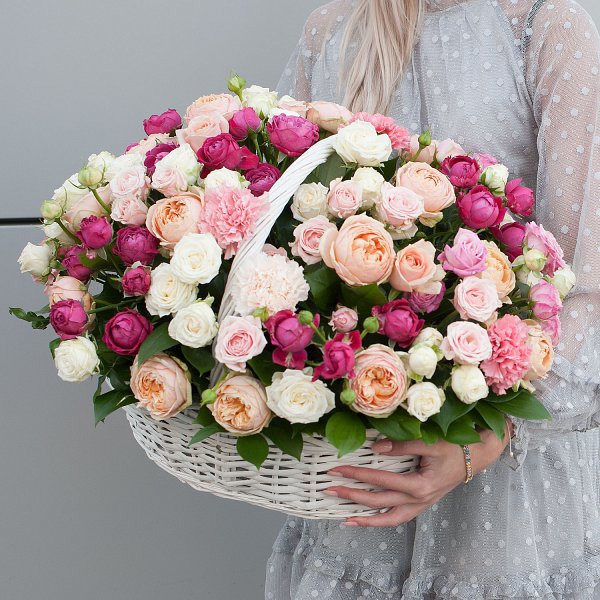 Корзина из пионовидных, одноголовых и кустовых роз и гвоздик "Время цветов" - это изысканный и стильный подарок, который подойдет для любого повода.
