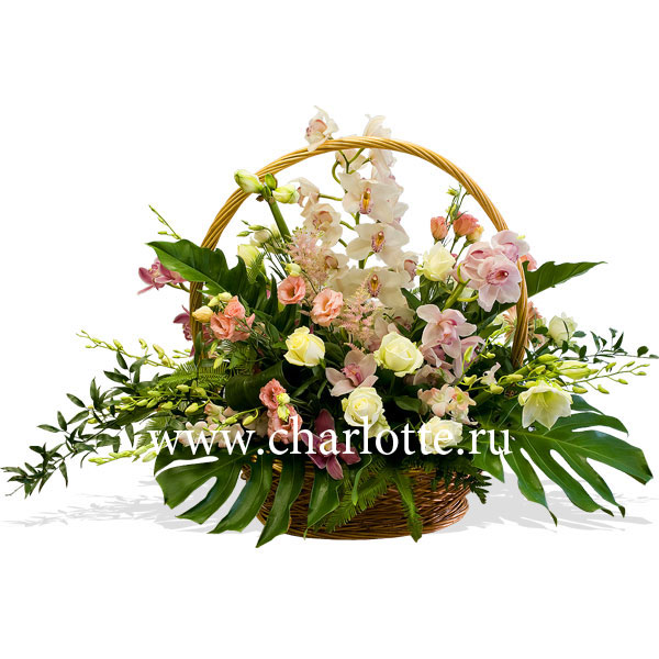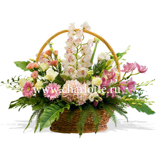 Корзина в розовых тонах из орхидей, роз, гербер, гортензии, лизиантусов, амарилисов, а так же множеством декоративной зелени.