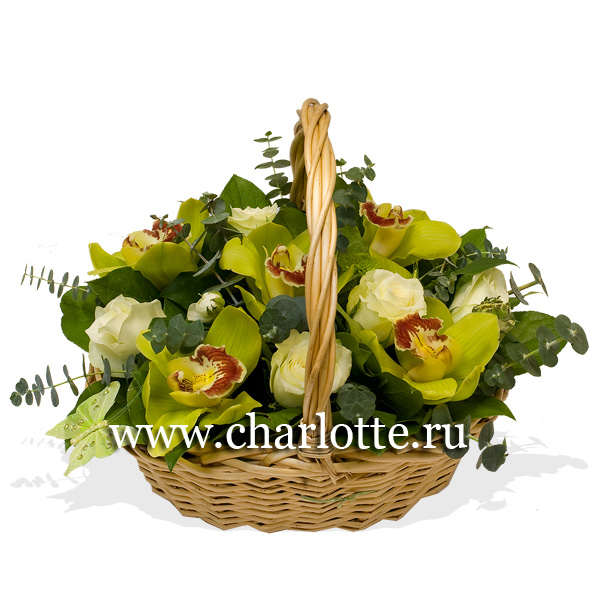 Корзина из белых роз и орхидей с декоративной зеленью. По Вашему желанию цветовую гамму композиции можно изменить, для этого звоните в наши салоны цветов или указывайте в разделе "комментарии для флориста" при заказе через интернет.