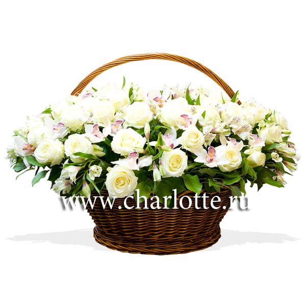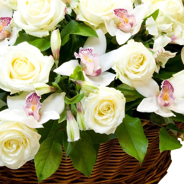 Корзина из белых роз, белых орхидей, белой альстромерии с декоративной зеленью.
