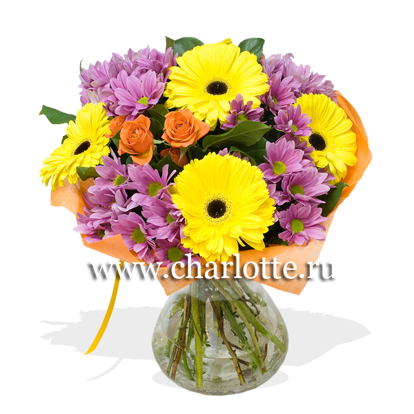 Букет в ярких тонах из гербер, хризантем, кустовых роз с декоративной зеленью в подарочной упаковке. По Вашему желанию цветовую гамму букета можно изменить, для этого звоните в наши салоны цветов или указывайте в разделе "комментарии для флориста" при заказе через интернет.
