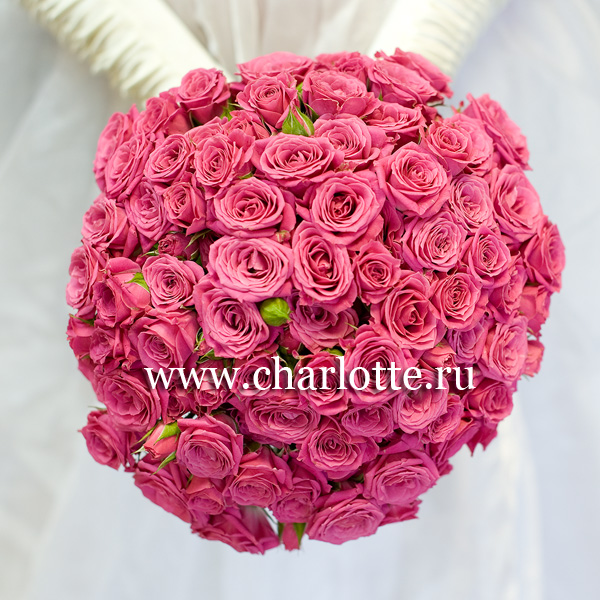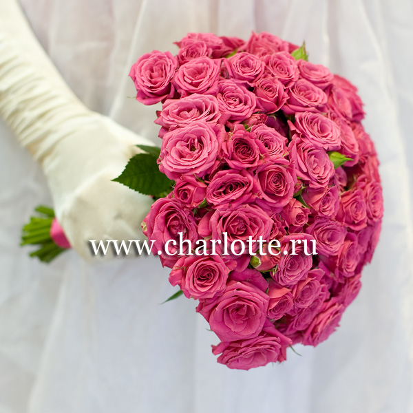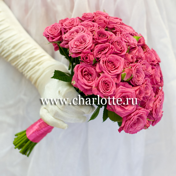 Букет невесты из ярко-розовых кустовых роз с открытыми ножками. По Вашему желанию цветовую гамму букета можно изменить, для этого звоните в наши салоны цветов или указывайте в разделе "комментарии для флориста" при заказе через интернет.