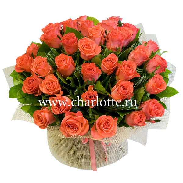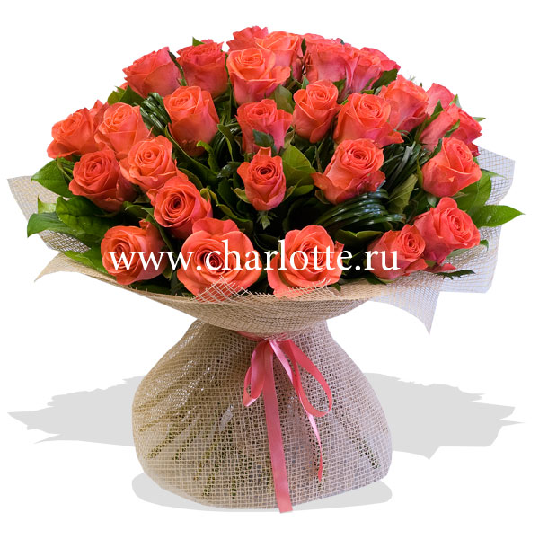 Букет из роз кораллового цвета с декоративной зеленью в подарочной упаковке. Цветы оформляются в подарочную упаковку на усмотрение нашего флориста. По Вашему желанию цветовую гамму букета можно изменить, для этого звоните в наши салоны цветов или указывайте в разделе "комментарии для флориста" при заказе через интернет.