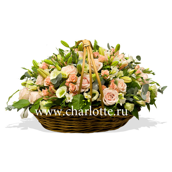 Корзина в нежных тонах из роз, лилий, лизиантусов, фрезий. По Вашему желанию цветовую гамму букета можно изменить, для этого звоните в наши салоны цветов или указывайте в оразделе "комментарии для флориста" при заказе через интернет.