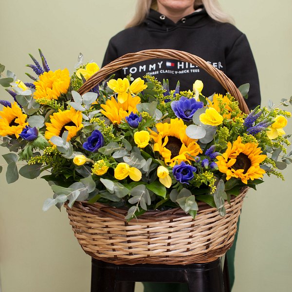 Композиция состоит из подсолнухов, нарциссов, анемонов и вероники, дополненных декоративной зеленью. Такое сочетание цветов создает яркую и солнечную атмосферу, которая будет радовать глаз и поднимать настроение.