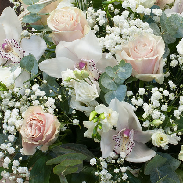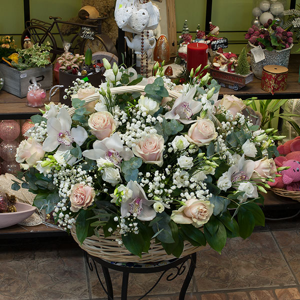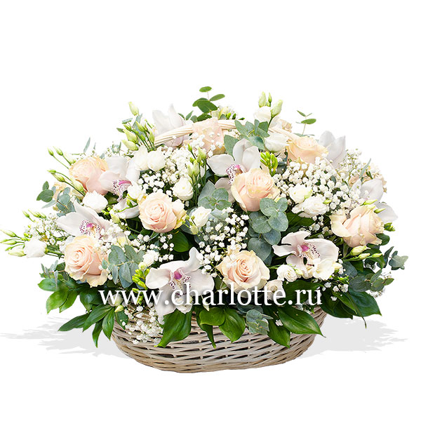 Корзина в нежных тонах из элитной эквадорской розы премиум класса нежных оттегков, белого лизиантуса, гипсофилы, белой орхидеи цимбидиум, эвкалипта с декоративной зеленью в корзине. По Вашему желанию цветовую гамму композиции можно изменить, для этого звоните в наши салоны цветов или указывайте в разделе "комментарии для флориста" при заказе через интернет.