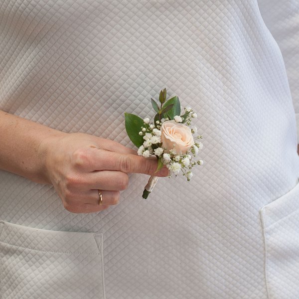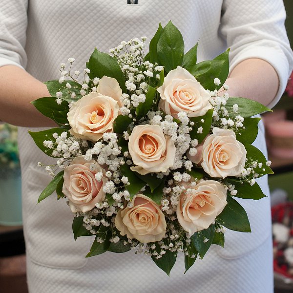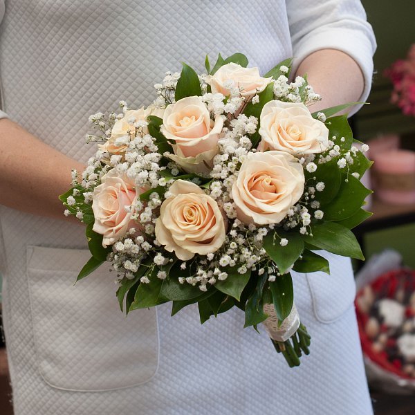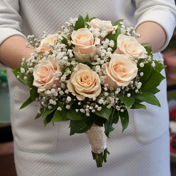 Букет невесты из кремовых роз сорта Талея с декоративной зеленью и гипсофилой. К букету невесты рекомендуем заказать бутоньерку для жениха, а так же лепестки роз для свадебного торжества.