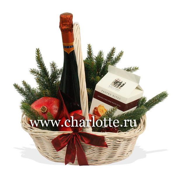 Подарочная новогодняя корзина с игристым 0,7 (в подарок), гранатами и печеньем. По Вашему желанию состав корзинки можно изменить, для этого звоните в наши салоны цветов или указывайте в разделе "комментарии для флориста" при заказе через интернет.