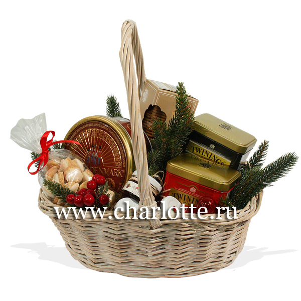 Новогодняя корзинка с чаем и печеньем. По Вашему желанию состав корзины можно изменить, для этого звоните в наши салоны цветов или указывайте в разделе "комментарии для флориста" при заказе через интернет.