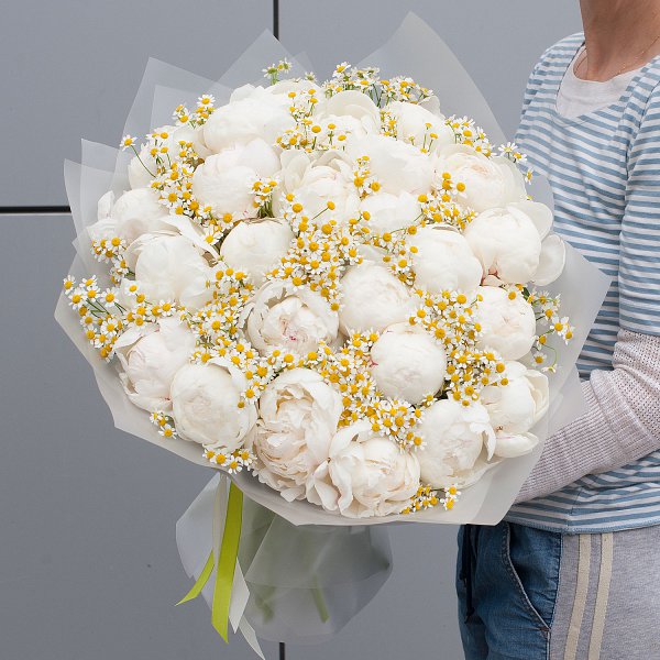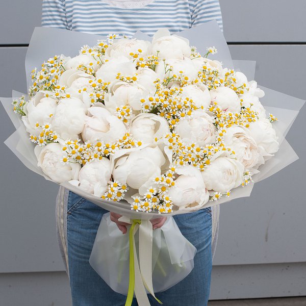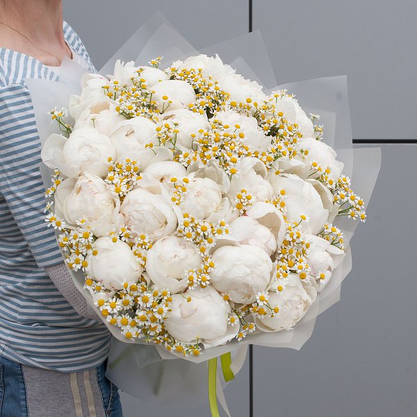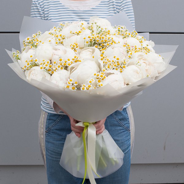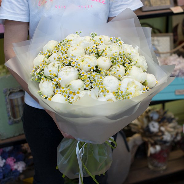 Букет из белых пионов с мелкой ромашкой в дизайнерской пленке.