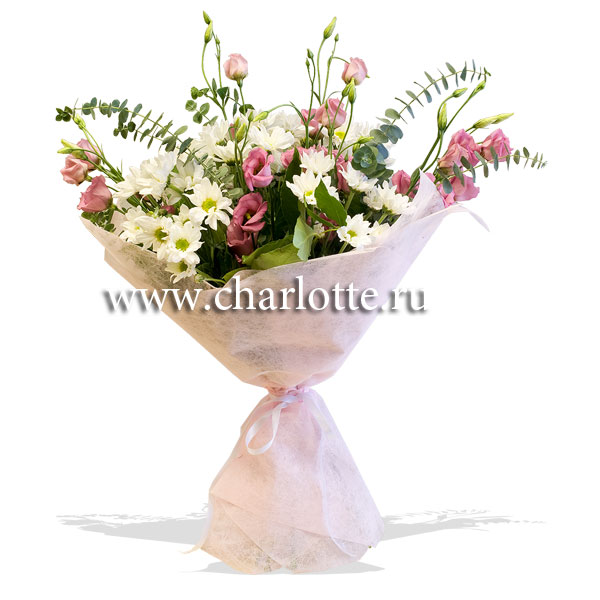 Букет из белых кустовых хризантем, розовых лизиантусов, декоративной зелени. Цветы оформляются в подарочную упаковку на усмотрение нашего флориста.