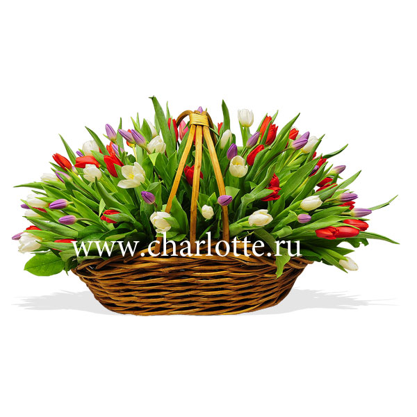 Корзина тюльпанов "Красный, белый, фиолетовый" (артикул 901-C)