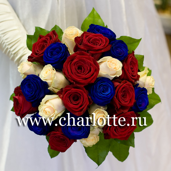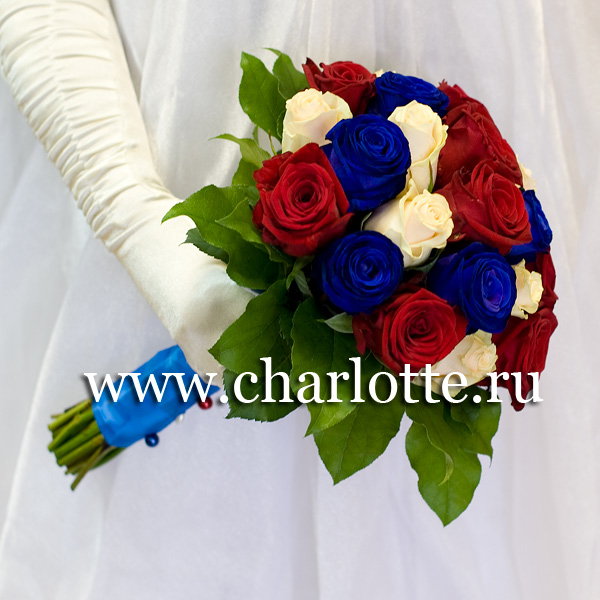Букет невесты из красных, синих и белых роз на своих ногах.