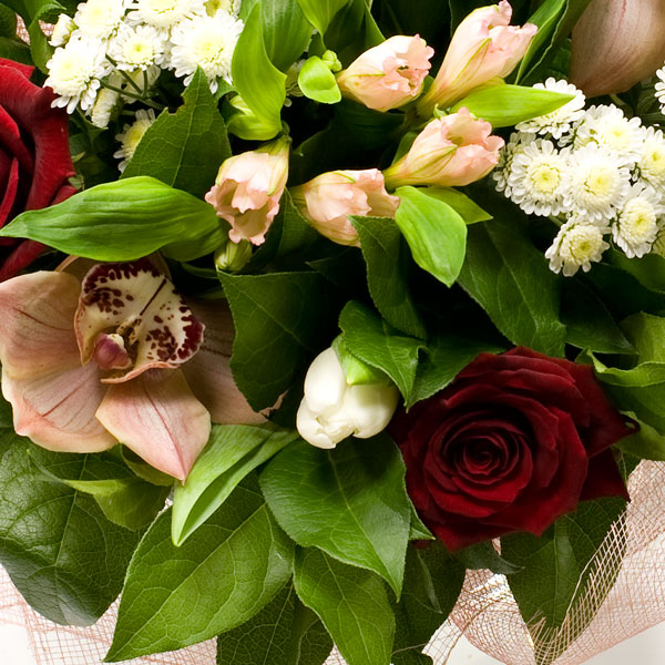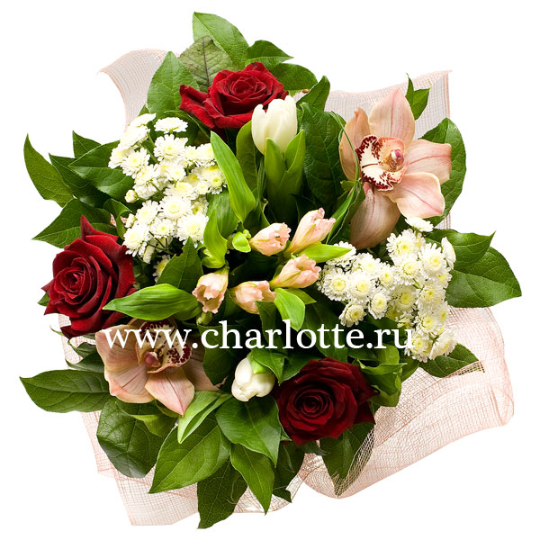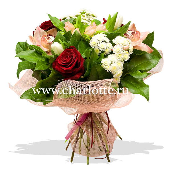 Букет из роз Гран При, хризантем, орхидей, альстромерии, тюльпанов с декоративной зеленью. Цветы оформляются в подарочную упаковку на усмотрение нашего флориста. По Вашему желанию цветовую гамму букета можно изменить, для этого звоните в наши салоны цветов или указывайте в разделе "комментарии для флориста при заказе через интернет.