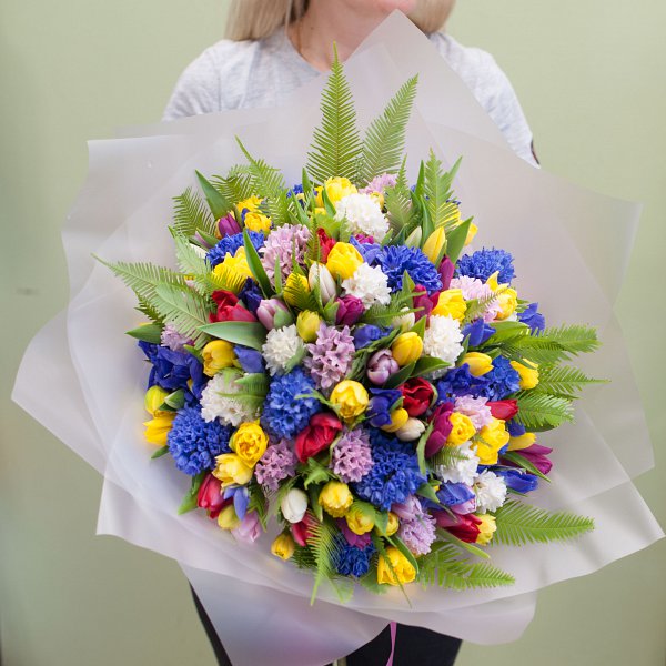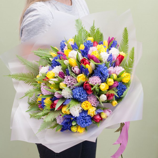Букет из весенних цветов: разноцветных гиацинтов, разноцветных тюльпанов, желтых нарциссов и синих ирисов, - в дизайнерской упаковке.
