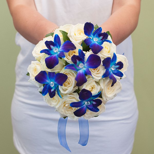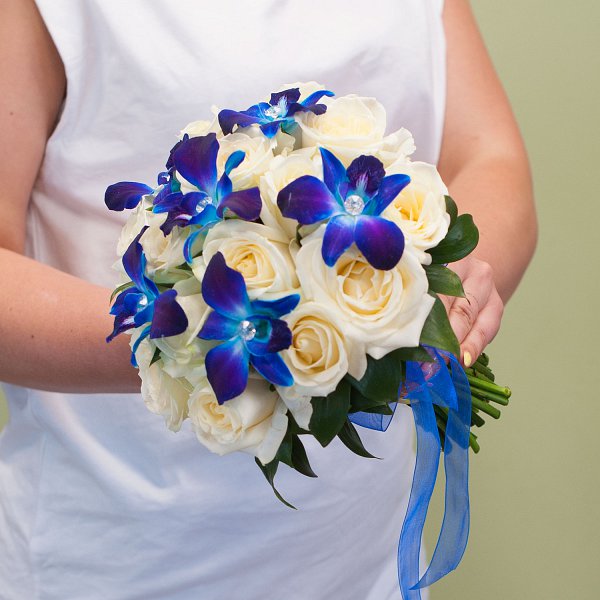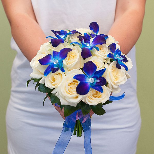 Букет выполнен в классическом сочетании синего и белого цветов, что делает его элегантным и утонченным.