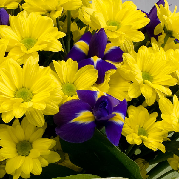 Букет собранный на контрасте из желтых хризантем и синих ирисов. Цветы оформляются в подарочную упаковку на усмотрение нашего флориста.