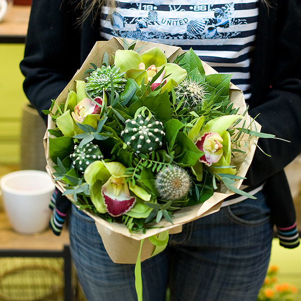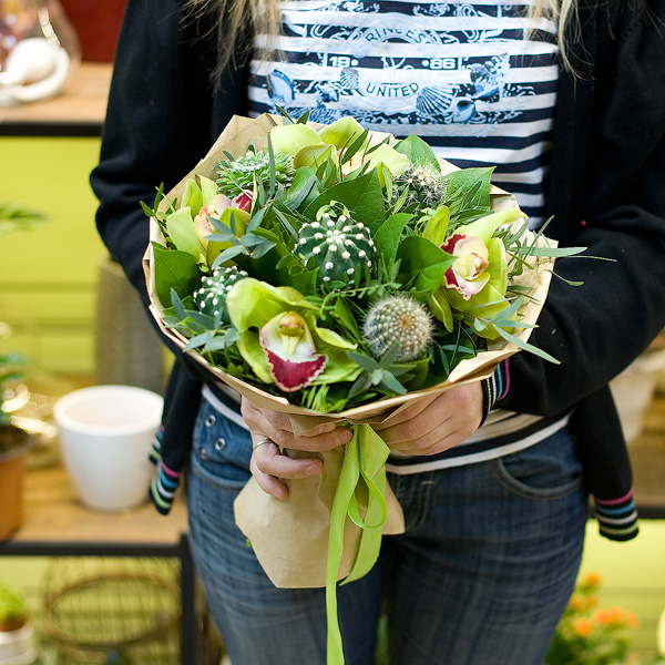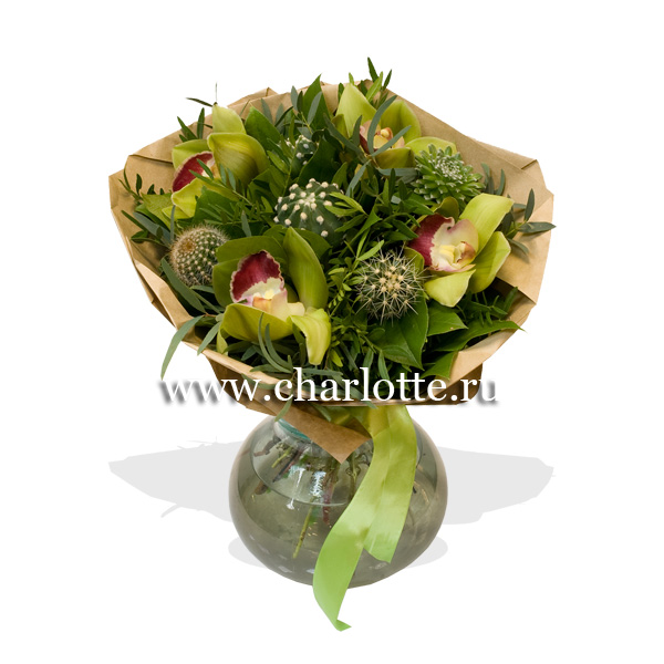 Очень необычный букет из кактусов и зеленых орхидей цимбидиум. По Вашему желанию цветовую гамму букета можно изменить, для этого звоните в наши салоны цветов или указывайте в разделе "комментарии для флориста" при заказе через интернет.